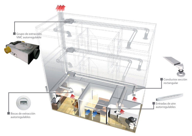 El sistema de Ventilación Mecánica Controlada (VMC) de simple flujo es aplicable al hábitat colectivo como individual, siendo su funcionamiento permanente, garantizando la Calidad del Aire Interior a través del principio de barrido del aire dentro de la vivienda.